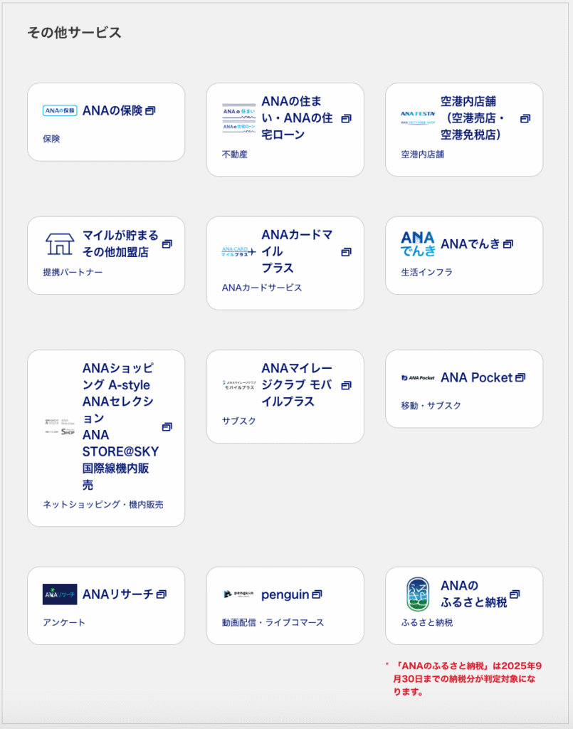 「ライフソリューション」とは、ANAが提供する日常生活の中でマイルが貯まるサービス群のこと。